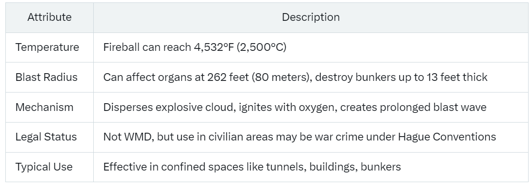 While not classified as weapons of mass destruction under international law (which typically includes nuclear, chemical, and biological weapons), thermobaric weapons are often described as second only to nuclear arms in lethality due to their destructive potential.