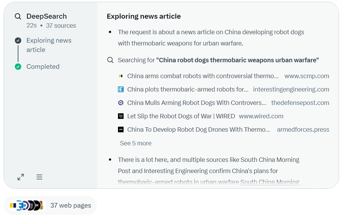 This post provides a examination of China's exploration of equipping robot dogs with thermobaric weapons for urban warfare supremacy, as reported in recent news from February 2025. The analysis covers the nature of thermobaric weapons, the context of the proposal, its implications, and the current state of development, aiming to offer a thorough understanding for readers interested in military technology and its ethical dimensions. I used Grok’s new DeepSearch for this one.