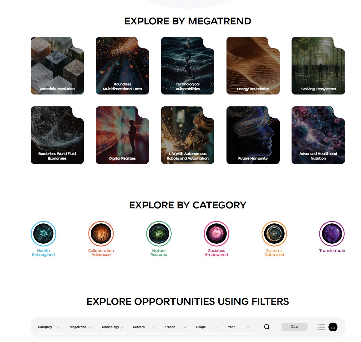 Filter opportunities by Category, Megatrend, Technology, Sector, Trends, Scope, and Year.