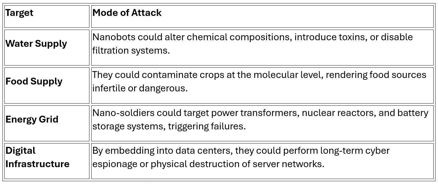 Nanoweaponry could lead to an era where conflicts are no longer fought with tanks and missiles but through unseen attacks on infrastructure, economies, and populations. A nation’s economy might collapse due to imperceptible failures in key industries, and political instability could be engineered through targeted attacks on communication systems, health networks, and food supplies—all without conventional military action.