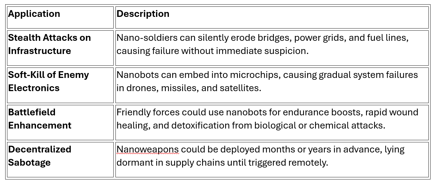 Nanoweapons have the potential to become the most powerful and uncontrollable form of warfare ever developed. If a nation masters self-replicating nano-soldiers before adequate countermeasures are in place, it could hold unparalleled strategic dominance. However, strong global regulations, AI control mechanisms, and counter-nanotech measures may be the only way to prevent their misuse. Whether nanoweapons remain a covert tool of superpowers or escalate into an existential global threat will depend on how they are developed, regulated, and defended against in the coming decades.